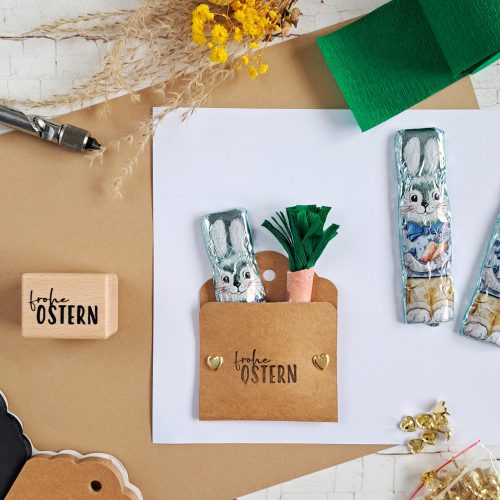 - Anleitung: Falte den Anhänger zu einer kleinen Tasche und setze an die Ränder jeweils mittig ein Loch durch die du die Buchklammern führst. Gestalte die Vorderseite nach Belieben. Rolle den Geldschein zu einer kleinen Tüte zusammen und nutze das Krebband als Möhrengrün. Platziere Schokohasen und Geldschein in der Tasche. Diese kannst du nun nach Bedarf noch mit einem Band aufhängen. Auf meinem Instagram Profil findest du ein kurzes Anleitunsvideo hierzu.